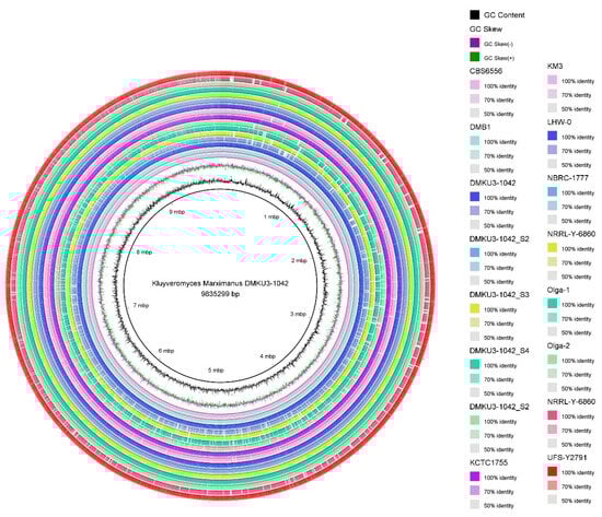 The constructed phylogenetic tree showed four clusters from the root based on comparative tree analysis at the whole-genome level (Figure 1), different colors of lines were each signed representing the clades (red represented Clade A, Blue represented Clade B, Green represented Clade C, and Black Represented Clade D). All strains in the first clade (composed of IIPE453, DMKU3-1042 GCF, FIM1, DMB1, and DMB0901) were isolated in Europe except KCTC1755 which was isolated in America. In the second clade, the strains were isolated in different locations (Mexico, Japan, and South Africa) and were composed of CBS6556, NBRC 1777, and LHW-0. In the third clade (composed of NRRL Y-6860, Olga 1, L03, DMKU3-1042 S4, Olga 2, DMKU3-1042 S3, DMKU3-1042 S1, DMKU3-1042 S5, DMKU3-1042 S2, and KM3), all five isolates of K. marxianus DMKU3-1042 genome sequences were grouped with other strains in Ecuador, Germany, Ireland, and China. The fourth clade was composed of UFS-Y2791 isolated in South Africa and SLP1_000000F_001 in Mexico. The genome map shows the whole-genome comparison of each of the five isolates compared to other genome strains as shown in Figure 2. Phylogenetic analysis plays a crucial role in investigating diverse biological inquiries, including the interconnections between species or gene and the alterations in population dynamics and species migration []. Additionally, Table 2 describes the average nucleotide identity (ANI) of K. marxianus as compared to other genomes at the cut off 95% species demarcation criteria. The estimation of genetic relatedness between genomes is a crucial task in determining species boundaries. In recent years, the whole-genome average nucleotide identity (ANI) has emerged as a reliable method for this purpose. Typically, organisms belonging to the same species exhibit an ANI of ≥95% among themselves. ANI measures the average nucleotide identity of all orthologous genes shared between two genomes and provides a robust distinction between strains of the same or closely related species (i.e., exhibiting 80–100% ANI). It is important to note that ANI does not solely represent core genome evolutionary relatedness, as orthologous genes can vary significantly between genome pairs []
