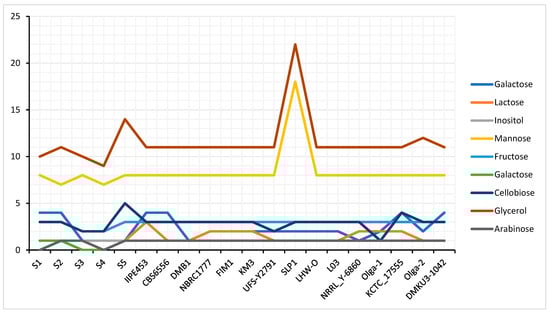 In various commercial applications, K. marxianus strains were proved to be an important yeast for industrial usage due to their capacity to utilize a wide range of sugars and produce ethanol by fermentation alongside other beneficial properties []. In respect to this, performing annotation of K. marxianus genome strains, from the functional categories in metabolism, we found relevant genes that code for the utilization of certain sugars at their initial catabolism including galactose, lactose, mannose, sucrose, fructose, xylose, arabinose, glycerol, and cellobiose. As shown in Figure 4, the genes encoding each of the utilized sugar are distributed differently across the K. marxianus strains. Comparatively across the strains, we found that there were more genes that code for glycerol and mannose utilization than other sugars, with galactose and arabinose being the least. Specifically, in the five isolates of K. marxianus DMKU3-1042, both RAG2 (Galactose-1-phosphate uridylyltransferase, EC 2.7.7.10) and HXK2 (RAG5) (Hexokinase, EC 2.7.1.1) are the encoding genes relevant to glucose, fructose, and mannose utilization. PMI40 (Mannose 6-phosphateisomerase, EC 5.3.1.8) is another gene also found to encode only mannose. GAL1 (Galactokinase), GAL7 (Galactose-1-phosphate uridylyltransferase, EC 2.7.7.10), and GAL5 (PGM2) (Phosphoglucomutase, EC 5.4.2.2) encode galactose utilization while XYL1 (Xylose reductase EC 1.1.1), XYL 2 (Xylitol dehydrogenase, EC 1.1.1.9), and XKS1 (Xylulokinase, EC 2.7.1.17) encode xylose utilization. ARA1 (Arabinose dehydrogenase [NADP+ dependent]), PRS5 (Ribose-phosphate pyrophosphokinase 5), DLD1 (D-Lactate dehydrogenase [cytochrome] 1, mitochondrial), and DLD2 D-Lactate dehydrogenase [cytochrome] 2, mitochondrial encode Arabinose sugar utilization. GPD1 (Glycerol-3-phosphate dehydrogenase [NAD(+)] 1, EC 1.1.1.94), GUT2 (Glycerol-3-phosphate dehydrogenase, mitochondrial), and GUT1 (Glycerol kinase, EC 2.7.130) encode glycerol sugar utilization and are mostly distributed across isolates. GAL80 (Galactose/lactose metabolism regulatory protein) encodes lactose and β-glucosidase (EC 3.2.1.21). ASF2 (Endo-1,3(4)- β -glucanase 2, EC 2.3.1.6) encodes cellobiose sugar utilization and lastly ADH1 (Alcohol dehydrogenase 1, EC 1.1.1.1), encodes sucrose, raffinose, and inulin sugar utilization. Some of these encoded genes are widely distributed differently across the genomes while others are distributed evenly as shown in Figure 4.