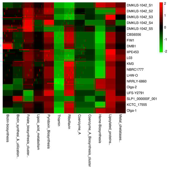 Considering vitamins, coenzymes, and prosthetic groups as part of the metabolism functional categories, we compared the K. marxianus strains based on the aggregate number of encoded gene contents found in each subsystem name. In our analysis, we discovered a close range in numbers of the encoded genes when compared to other investigated strains for each of the subsystem names as shown in Figure 5. Vitamins are essentially needed by the natural host due to the nutritional benefits required to perform biochemical reactions by all living cells [] and in relation to this category, we found six main subsystem names (thiamin, riboflavin, pyridoxine, biotin, folate, lipoic acid) in all the genome strains with a total of 27 encoding genes. Specifically, from our isolates (DMKU3-1042_S1, DMKU3-1042_S2, DMKU3-1042_S3, DMKU3-1042_S4, and DMKU3-1042_S5), the encoded genes were found to play important role in the biosynthesis of various vitamins including B1 (Thiamin), B2 (Riboflavin), B6 (Pyridoxine), B7 (Biotin), B9 (Folate), and B-complex vitamin (lipoic acid). Thiamin is encoded by a gene (NUDIX hydrolase, associated with Thiamin pyrophosphokinase) and was found common across the compared strains. Coenzyme as a key component that is involved in cellular metabolism, notable for its role in a large portion of the cellular oxidative pathways including carbohydrate and amino acid oxidations, fatty acid β-oxidation, and the Krebs cycle []. Considering this, we found ranges of encoding genes for 2 Coenzyme A subsystem names (Coenzyme A—gjo and Coenzyme A biosynthesis cluster) in our isolates, as well as other investigated strains (Figure 5). Based on the Coenzyme A—gjo, the genes revealed in all strains include two copies encoding phosphopantothenoylcysteine decarboxylase (EC 4.1.1.36), pantoate–beta-alanine ligase (EC 6.3.2.1), and phosphopantothenoylcysteine synthetase (EC 6.3.2.5) while in Coenzyme A biosynthesis cluster includes two copies encoding 2-dehydropantoate 2-reductase (EC 1.1.1.169), 3-methyl-2-oxobutanoate hydroxymethyltransferase (EC 2.1.2.11), and pantoate–beta-alanine ligase (EC 6.3.2.1). Other subsystems known as prosthetic groups in this category include heme biosynthesis, lipoylated proteins, and metal chelatases.