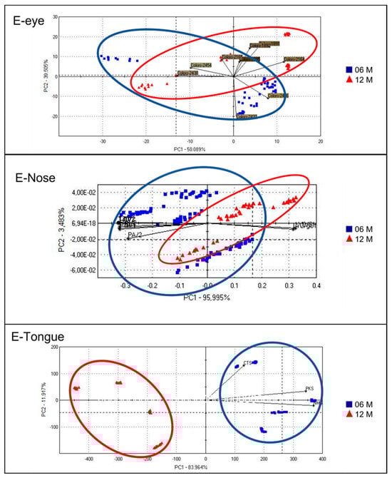 PCA plot of E-eye, E-nose, and E-tongue results of Caciocavallo Podolico Lucano, grouped according to the ripening period (6 months, blue; 12 months, red). DI= −8 for E-eye; Di= −9 for E-nose; DI= 52 for E-tongue.
