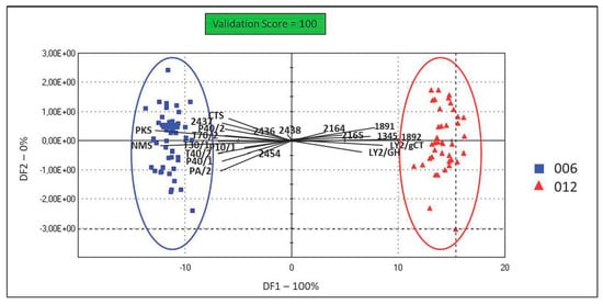 The sensorial fingerprint of CPL cheese was obtained using an innovative platform of “artificial senses” consisting of an E-eye (IRIS Visual Analyzer VA4000—Alpha M.O.S.), an E-nose (α-Fox 4000—Alpha M.O.S.), and an E-tongue (αAstree—Alpha M.O.S.). Cheese samples of 6- and 12-month-aged cheese were stored at −17 °C; then, they were thawed and left at room temperature for around 15 min before sensory analyses. For the E-eye, each sample was positioned inside the measurement chamber for colour profile analysis to be performed. Sixteen images for each sample were taken against a black background with light from the top []. Digital cameras are able to register the colour of any pixel from the image using three-colour sensors per pixel, which capture the intensity of light in the red (R), green (G), or blue (B) spectrum. Chemical compounds showing the five basic taste qualities were evaluated with an E-tongue; for this, 4 g of each sample was minced and made up to 50 mL with bi-distilled water, homogenised for 2 min with Ultra Turrax (T25; Ika Works Inc., Wilmington, NC, USA), and centrifuged at 3000 rpm for 15 min at 4 °C []. The obtained solution was filtered and put in a beaker for analysis with seven chemical sensors. Each sample was examined 30 times, and each acquisition lasted 120 s; after each measurement, the sensors were cleaned with bi-distilled water. In order to perform the odour profile, samples were submitted to an E-nose. Samples of 2 g of finely shredded cheese were taken from the middle of each cheese and placed in headspace vials with magnetic caps. For each sample, 4 vials were prepared, incubated for 5 min at 60 °C at agitation speed of 500 rpm for 5 s, and injected []. Each acquisition lasted 18 min. Results from the three instruments were used to build the new sensorial fingerprint for 6- and 12-month-ripened cheeses.