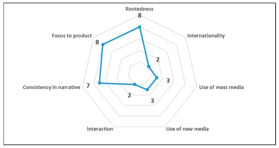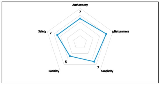 The results of the socio-semiotic evaluation linked to the communication analysis of the CPL web pages are depicted in two graphs, Figure 7 and Figure 8. The major weaknesses identified through the evaluation were internationality (score 2), due to the sites being available only in Italian without the possibility of translation, and interaction (score 2), due to the absence of an interactive community. Poor use and connection with traditional mass media (score 3) and new media, such as social networks (score 3), were also highlighted. However, the evaluation identified several strengths, including a consistent narrative (score 7), well linked to the product and its origins, and a strong focus on the product (score 8), which is central to communication. The evaluation checklist also showed that the communication trends (Figure 8), including authenticity, simplicity, security (score 7), and naturalness (score 8), were effectively transmitted via web communication. The only aspect lacking was the social aspect (score 5) due to the lack of a community and connection with new media, which limits interaction. These results agree with Philippidis et al. [], who observed that the concept of authenticity, associated with traditional cheese, is considered one of the main drivers in consumers’ attitudes towards brands and products []. The perception of territoriality leads consumers to a greater propensity to buy and a greater sense of perceived safety and emotion []. Indeed, the safety perception was shown to play a mediating role between the perception of territoriality and the propensity to buy []. Additionally, van Ittersum et al. [] confirmed the fundamental importance of the certification labels as a symbol of protection connected to the territory. A strong point for CPL cheese is the presence of salient information, especially about the attention to the narrative in storytelling, which very well emphasises the strengths linked to authenticity and territoriality, and the presence of producers and specialised food and wine sites. The use of this socio-semiotic analysis can be considered a starting point for a critical evaluation of the state of the art of web communication in the traditional dairy sector of southern Italy. This analysis fits into a broader and more specific context for the preparation and optimisation of drivers useful for effective CPL product communication.
