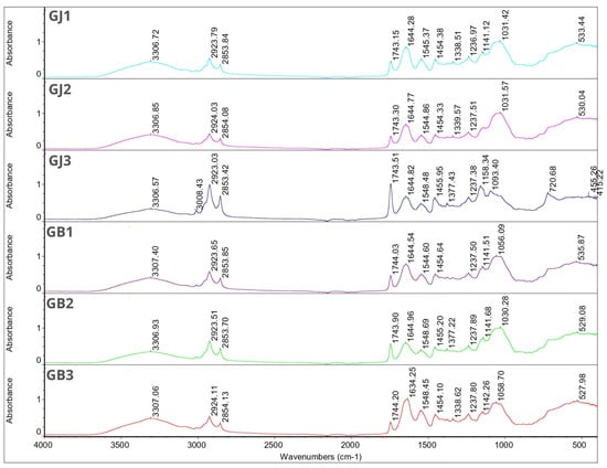 FT-IR spectra for samples GJ1, GJ2, GJ3, GB1, GB2 and GB3.