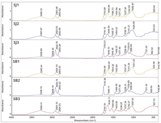 FT-IR spectra for samples SJ1, SJ2, SJ3, SB1, SB2 and SB3.