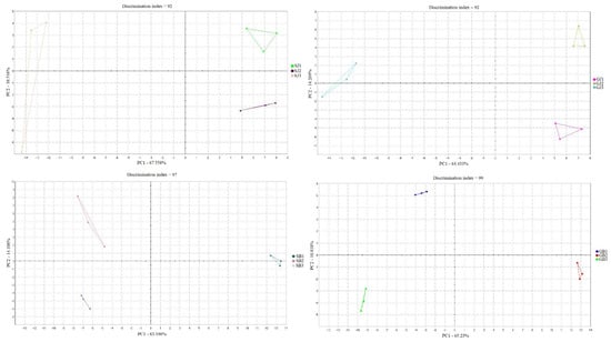 Figure 3 presents the classification of scent profiles in relation to their experimental groups. Samples are represented in a two-dimensional plane with reference to selected components: principal component 1 and principal component 2. When considering essential oils separately, it can be concluded that, in the case of grape seed with juniper as an essential oil, the total contribution variances of PC1 and PC2 for direct electronic nose measurements were 60.6% and 14.27%, respectively. The combination of grape seed and black pepper as essential oil resulted in values explaining 65.23% of the data variance, where 10.81% was intercepted by the horizontal axis, explaining differences among samples along that axis. For soybean with juniper, the total contribution variances of PC1 and PC2 for direct electronic nose measurements were 63.21% and 14.10%, respectively. Soybean with black pepper caused a 67.56% data variance, with 10.51% intercepted by the horizontal axis. Additionally, there was no overlap between the mixing ratios of the single samples for all essential oils.