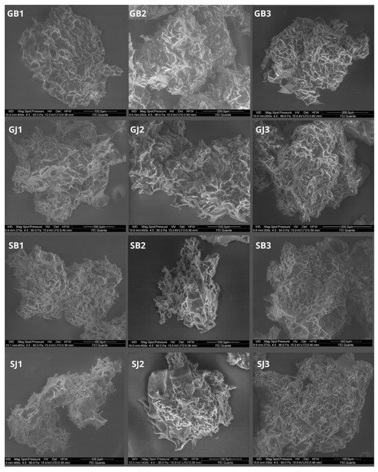 The size of microcapsules should be in the range of 0.1 μm to 100 μm [12]. The particle sizes in all tested trials met these assumptions. The obtained results depend on all examined factors individually and their interactions. However, the mixing ratio of polymers had the greatest influence (p < 0.05). The highest values of the SI characterized the GJ3, GB3, SB3, and SJ3 samples. This means they had the highest diversity in terms of particle size (Table 5) [48]. In sample GJ3, the SI was the closest to 1.0 (SI = 0.96), so this powder contained particles with the most uniform size distribution in the tested ranges [48]. The smallest range of particle sizes and the smallest SI value were found for samples SB2 and GB2 (D10 = 59.04 ± 1.18 μm, D90 = 96.72 ± 0.5 μm, SI = 0.43 ± 0.01 and D10 = 60.13 ± 0.74 μm, D90 = 96.86 ± 0.41 μm, SI = 0.44 ± 0.01, respectively). The smallest powder particles were obtained for a mixing ratio of 1:1 (GB1, SJ1, SB1). However, no clear relationship was observed between the increase in the content of one polymer and the size of the obtained powder particles.