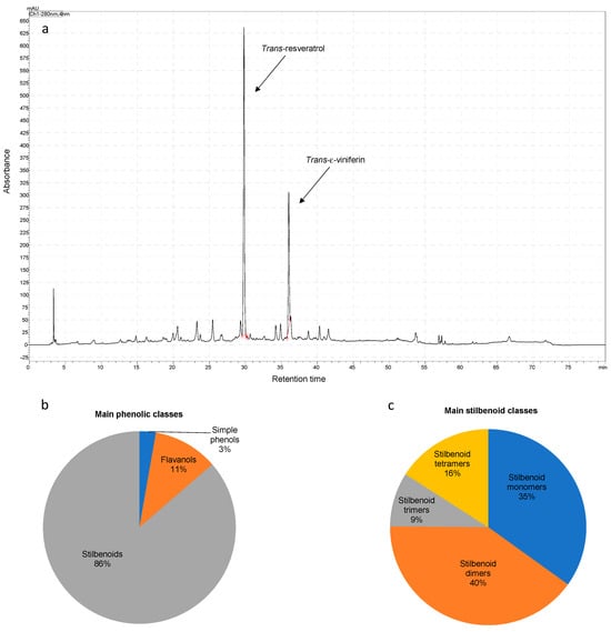 (a) UV chromatogram of the vine shoot extract at 280 nm. (b) Distribution of phenolic classes and (c) stilbenoids using the relative area obtained by RP-QTOF-MS. Simple phenols refer to gallic acid and phenol aldehydes.