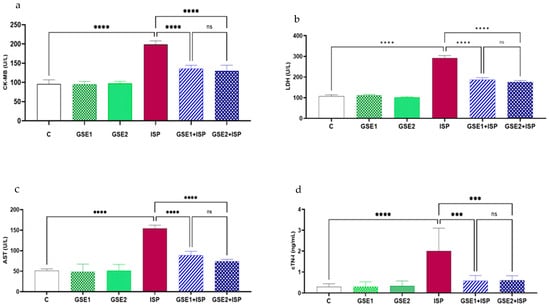 Plasma activities of (a) creatine kinase-MB (CK-MB), (b) lactate dehydrogenase (LDH), (c) aspartate aminotransferase (AST), and (d) cTn-I levels in normal and treated rats (mean ± SD; n = 6 rats per group). C, control; GSE, grapevine shoot extract; ISP, isoproterenol. **** p < 0.0001: ISP vs. C; *** p < 0.001 or **** p < 0.0001: GSE1 + ISP/GSE2 + ISP vs. ISP; ns (not significant): GSE1 + ISP vs. GSE2 + ISP.