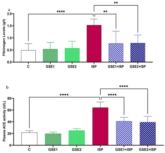 Changes in the (a) fibrinogen levels and (b) angiotensin-converting enzyme (ACE) activity in the plasma of different animal groups (mean ± SD; n= 6 rats per group). C, control; GSE, grapevine shoot extract; ISP, isoproterenol. **** p < 0.0001: ISP vs. C; ** p < 0.01 or **** p < 0.0001: GSE1 + ISP/GSE2 + ISP vs. ISP.