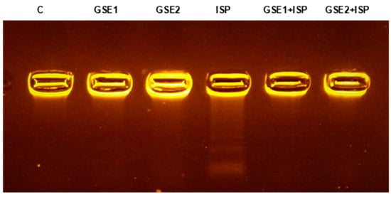 The effect of the different treatments on the integrity of genomic DNA from cardiac tissue is illustrated in Figure 4. An intact band was observed in the DNA electrophoretic gel of control rats (lane 1). Significant DNA damage was induced by ISP treatment, resulting in DNA fragmentation showing a mixture of smearing and laddering (lane 4). On the other hand, the pre-co-administration with GSE1 or GSE2 (lanes 5 and 6, respectively) decreased the observed ISP-induced genotoxicity (Figure 4).