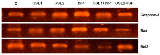 Figure 5 presents the cardiac mRNA expression of caspase-3, Bax, and Bcl2 in the studied animals. In the ISP group, the results showed a remarkable up-regulation of pro-apoptotic biomarkers caspase-3 and Bax compared to the untreated group. The pre-co-administration with GSE1 or GSE2 significantly reduced the observed overexpression associated with ISP. Alternatively, a down-regulation of the Bcl2 gene was observed for the ISP group, which was especially reverted in the GSE2-treated rats.