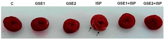 The results relative to rats’ body and heart weight and CWI are presented in Table 4. The studied groups did not exhibit any substantial changes in body weight. Nevertheless, the highest CWI (p < 0.05) was observed in the ISP group. It was also remarkable that GSE1 or GSE2 pre-co-treatment induced a significant decrease in relative heart weight in comparison with the ISP group.