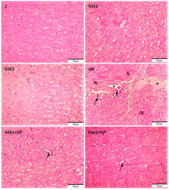 Histological images of heart tissue of the control and treated groups using hematoxylin and eosin staining at ×200 magnification. C, control; GSE, grapevine shoot extract; ISP, isoproterenol. Arrow: inflammatory cell infiltration; asterix: separation of cardiac myofibrillar; N: myocardial cell necrosis.