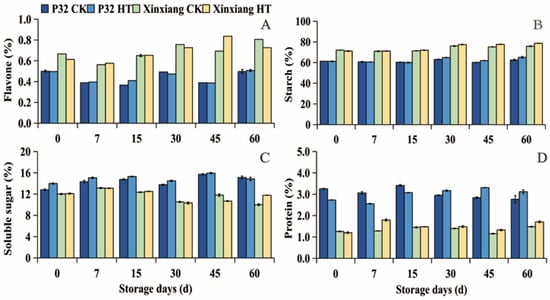 Flavone (A), starch (B), soluble sugar (C) and protein (D), in CK0 and HT0 (at 35 °C and 85% RH for 24 h) of P32 and Xinxiang tuber roots stored for 0, 7, 15, 30, 45 and 60 days at 13 °C and 85% RH. CK0 and HT0 mean the sweet potato chips not inoculated with R. stolonifer. Significant differences (p < 0.05) between means are not indicated by letters, but are presented in the Supplementary Materials section with a three-line table.