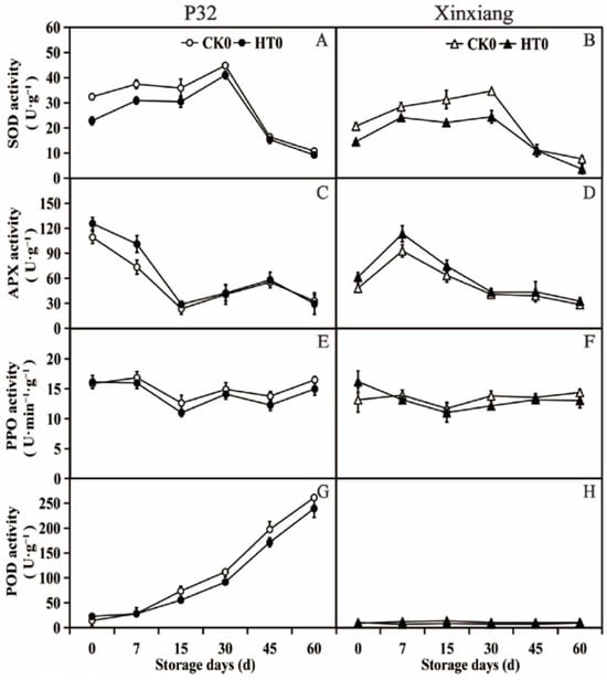 SOD activity (A,B), APX activity (C,D), PPO activity (E,F) and POD activity (G,H) in P32 and Xinxiang tuberous roots stored for 0, 7, 15, 30, 45 and 60 days at 13 °C and 85% RH. CK0 and HT0 mean the sweet potato chips not inoculated with R. stolonifer. Significant differences (p < 0.05) between means are not indicated by letters above the broken lines, but are presented in the Supplementary Materials with a three-line table.