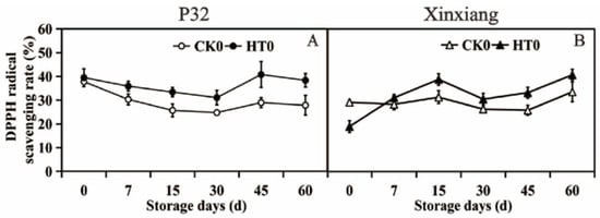 DPPH radical scavenging rate (A,B) in P32 and Xinxiang tuberous roots stored for 0, 7, 15, 30, 45 and 60 days at 13 °C and 85% RH. CK0 and HT0 mean the sweet potato chips not inoculated with R. stolonifer. Significant differences (p < 0.05) between means are not indicated by letters above the broken lines, but are presented in the Supplementary Materials with a three-line table.