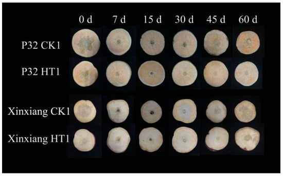 The effects of heat treatment of P32 and Xinxiang in CK1 and HT1 on the resistance of sweet potato chips to R. stolonifer during different storage periods were examined. We found that the diameter of disease spots initially decreased and then increased during the 60-day period. We hypothesized that the variation in the disease spot size might be attributed to the delayed activation of some defense mechanisms in sweet potato immediately after heat treatment. There was a time delay, and the effectiveness of these defense mechanisms gradually declined with the extension of the storage period. After heat treatment, the diameters of the disease spots on P32 and Xinxiang were significantly smaller than those on the CK1 samples, indicating that heat treatment effectively inhibits the spread of soft rot (Figure 5).
