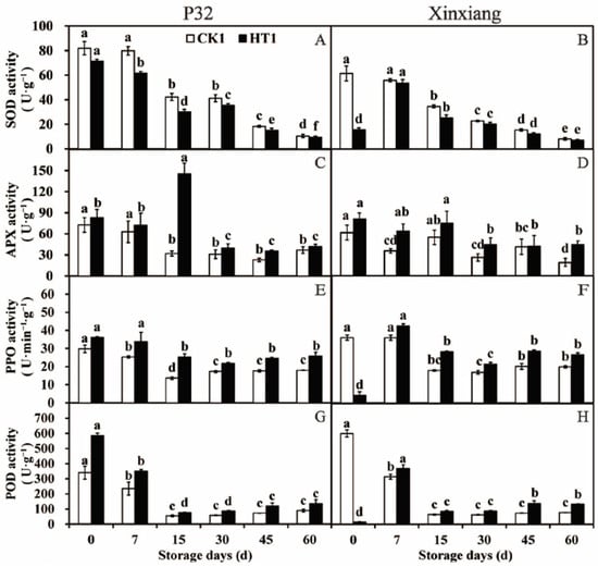 SOD activity (A,B), APX activity (C,D), PPO activity (E,F) and POD activity (G,H) in P32 and Xinxiang roots stored for 0, 7, 15, 30, 45 and 60 days at 13 °C and 85% RH. CK1 and HT1 mean the sweet potato chips inoculated with R. stolonifer. Significant differences (p < 0.05) between means are indicated by letters above the histogram bars.