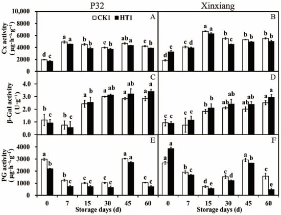 Cx activity (A,B), β-Gal activity (C,D) and PG activity (E,F) in P32 and Xinxiang roots stored for 0, 7, 15, 30, 45 and 60 days at 13 °C and 85% RH. CK1 and HT1 mean the sweet potato chips inoculated with R. stolonifer. Significant differences (p < 0.05) between means are indicated by letters above the histogram bars.