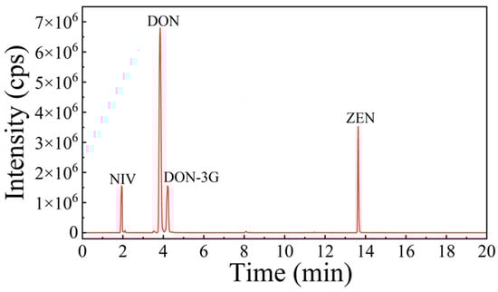 Chromatographic separation was realized using the QTRAP® 6500+ LC-MS/MS system (SCIEX, Framingham, MA, USA) with a CORTECS UHPLC C18 column (100 mm × 2.1 mm, 1.6 μm; Waters, Milford, MA, USA). The injection volume was 2 μL, and the flow rate was 0.3 mL/min with a column temperature of 40 °C. The mobile phases were water with 0.1% formic acid and 1 mM ammonium acetate (A) and MeOH (B). The gradient elution program was linearly applied by changing the mobile phase composition as follows: B 10–10%, 0–2 min; B 20–21%, 2–3 min; B 21–26%, 3–4 min; B 21–26%, 4–5 min; B 26–26%, 5–7 min; B 26–60%, 7–10.5 min; B 60–60%, 10.5–13.5 min; B 60–95%, 13.5–14.5 min; B 95–95%, 14.5–17 min; B 95–10%, 17–18 min; B 10–10%, 18–21 min. Samples were analysed in the MRM, and the ion source temperature and ion spray voltage under ESI (±) were set to 450 °C and ±4.5 kV, respectively. Nitrogen gas was applied as the cone gas (GS1), curtain gas, heating gas (GS2), and collision gas at pressures of 35, 30, 25, and 10 psi, respectively. MS/MS conditions of DON, NIV, DON-3G, ZEN were shown in Table 1. A chromatogram of four Fusarium mycotoxin in whole-wheat flour was shown in Figure 1.