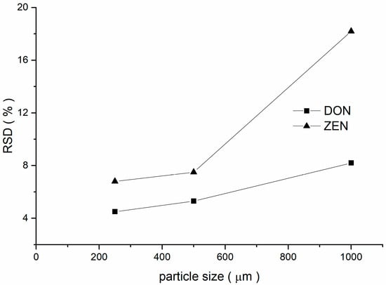 In the determination of mycotoxins, sample homogeneity was dependent on the particle size distribution of wheat [28]. The homogeneity of DON and ZEN in whole-wheat flour was examined for particle sizes of 250, 500, and 1000 µm, evaluated with a Relative Standard Deviation (RSD).