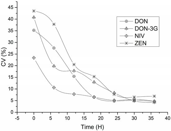 Wheat is rich in carbohydrates, proteins, dietary fibre, and trace elements, and its complex matrix makes homogenisation of whole-wheat flour difficult. Therefore, an experiment on mixing time and homogeneity was conducted to prepare the CRM candidate materials. Whole-wheat flour (30 kg) was mixed in a V-mixer at 60 rpm for 36 h. Whole-wheat flour samples were collected from different spatial locations of the mixer at the 6th, 12th, 18th, 24th, 30th and 36th hour of the mixing process at 6 h intervals. Figure 4 shows the relative standard deviations of the measured results for the four Fusarium mycotoxins in the whole-wheat flour. The coefficients of variation (CV%) decreased as the mixing time increased. The relative standard deviations of the DON and NIV measurements did not decrease significantly with increasing mixing time beyond 18 h. For DON-3G and ZEN, the relative standard deviations did not decrease significantly beyond a homogenisation time of 30 h. This implies that the homogenisation time should be greater than 36 h for whole-wheat flour. The differences in homogenisation times for different Fusarium mycotoxins may be related to the different distribution patterns of these toxins in wheat grains. Studies have shown that DON and NIV are evenly distributed throughout the grain, while ZEN and DON-3G are concentrated in the outer layer of wheat, i.e., the bran. Some studies have shown that the distribution of DON-3G is mainly concentrated in the outer layer of rice bran [29,30,31,32,33].