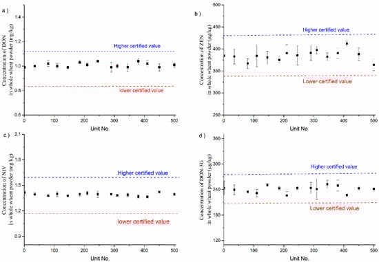 Homogeneity testing results for DON (a), NIV (b), DON-3G (c), and ZEN (d) in whole-wheat flour CRM. The error bars indicate the standard deviation within bottles.