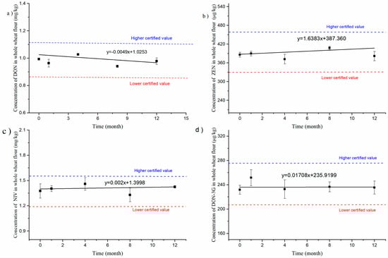 Long-term stability testing results at room temperature for DON (a), ZEN (b), NIV (c), and DON-3G (d) in whole-wheat flour CRM.