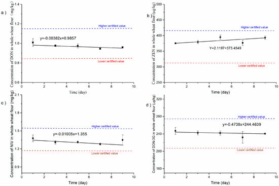 Short-term stability testing results at 40 °C for DON (a), ZEN (b), NIV (c), and DON-3G (d) in whole-wheat flour CRM.