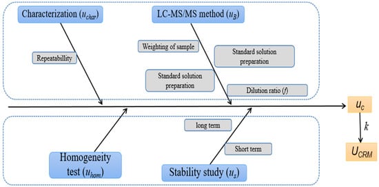 According to Equation (3), the sources of uncertainty for DON, NIV, DON-3G, and ZEN in whole-wheat flour were assignment analysis, homogeneity assessment, long-term stability, and short-term stability monitoring, as shown in the fishbone diagram in Figure 9. The uncertainty of assignment consists of the standard deviation of the mean of multiple laboratory measurements and the uncertainty of measurement model type B (i.e., the concentration of the standard solution, the volume of the sample solution, the mass of the sample, or the concentration of the sample solution). We assigned uncertainties according to the JJF 1059.1-2012 [35]; the sources of uncertainty and the evaluation results are shown in Table 3. Based on these sources, the relative standard uncertainty uC was calculated. The uncertainty is expressed as the synthetic uncertainty of the assignment, homogeneity, and stability tests with a coverage factor k = 2.