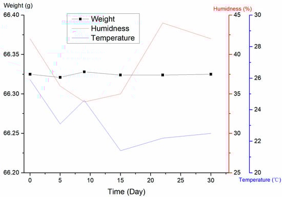 The moisture content of whole-wheat flour was measured using the drying method [36] to be 9.8%, with a relative standard deviation of 1.0% (Number = 9). The CRM was required to be placed at −18 °C for storage after opening the package, which involved multiple freezing and rewarming processes during use. Ambient temperature and humidity may affect the matrix moisture, thus leading to change in the number of mycotoxins. In this study, via simulating the actual use, the bags were placed in the −18 °C refrigerator after opening, removed six times at random times within 30 days, and the whole bags were weighed after rewarming and then stored at −18 °C. The temperature and humidity during the day were recorded, and the results are shown in Figure 10.