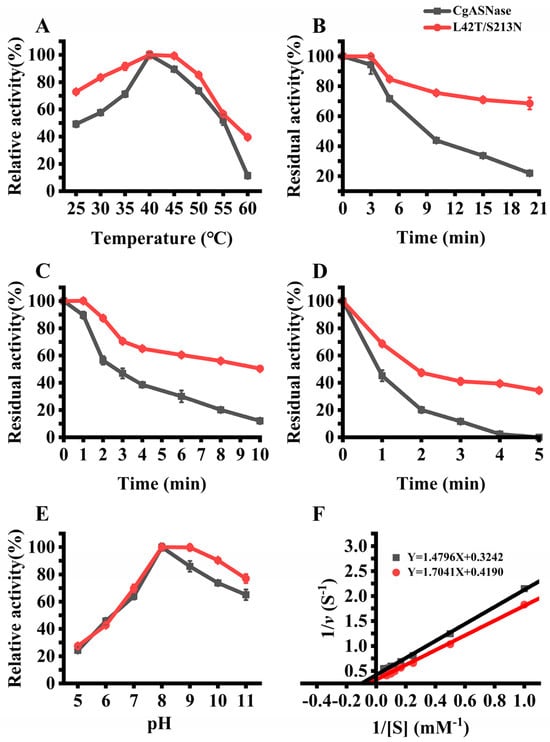 3.3. Enzymatic Characteristics of the Wild-Type CgASNase and Its Mutant Enzymes