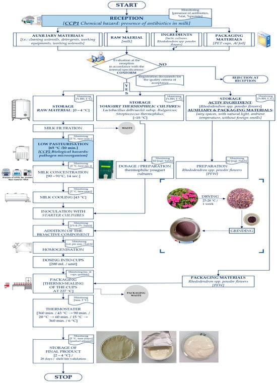 The technological process of yogurt preparation with Rhododendron powder begins with the reception stage of the raw material and ingredients (cow’s milk, lactic cultures, RFP) and auxiliary materials (Figure 1). From the standpoint of food safety, the raw material milk reception stage is the critical control point no. 1 (CCP) that, through measures taken at reception (qualitative rapid tests), eliminates the presence of antibiotic traces in milk [32]. Also, at this stage, the raw milk is analyzed in terms of its lipid and protein content. Following the evaluation at the reception, according to the internal specifications, the registration documents for the acceptance quality criteria are maintained.