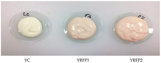 Figure 2 depicts the appearance of the yogurts after blending with the RFP at concentrations of 1.0 and 2.0 g/100 g (w/w). The powder was evenly distributed throughout the product without any stains or sedimentation. The resulting hue intensified as expected, with rising RFP concentrations. As a result, the RFP was able to provide the yogurt’s color.