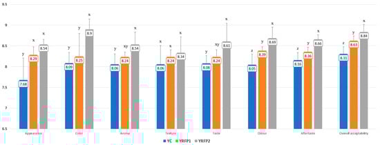 Sensory evaluation scores of control and fortified yogurts (averages with different letters “x”, “y”, “z” in the columns signify statistically significant differences (p < 0.05)).