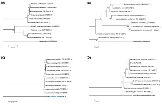 Among the strains isolated from various GF grains, lactic acid bacteria (LAB) were identified by 16S rRNA sequencing and yeast by 18S rRNA sequencing (Table 1). The bacterial species isolated from quinoa were W. confusa BAQ2 and L. brevis AQ2, whereas those from corn were L. citreum YC2. The strain isolated from buckwheat was identified as S. cerevisiae BW1 by 18S rRNA sequencing. To assess the phylogenetic relationships among the strains of pure-cultured LAB derived from gluten-free grains, their 16S rDNA gene fragments’ nucleotide sequences were determined. These sequences were then compared with those of the most closely related strains in the GenBank database to depict the resulting phylogenetic tree (Figure 1). Additionally, we analyzed the nucleotide sequences of the 18S rDNA gene fragments from isolated yeasts using the same methodology. This analysis aimed to investigate the phylogenetic relationships among the yeasts belonging to the Saccharomyces genus. The phylogenetic relationship of these isolated strains is displayed by a maximum composite likelihood-based neighbor-joining tree. In general, LAB isolated from sourdough or used as sourdough starters mostly belongs to the Lactobacillus, Pediococcus, Leuconostoc, and Weissella genera [19]. These strains play important roles when used as sourdough starters. The genus Lactobacillus produces aromatic compounds during sourdough fermentation, resulting in various types of flavors [20]. A mixed culture of L. brevis improves the organoleptic quality of GF bread by producing high concentrations of alcohol [4]. Leuconostoc and Weissella secrete dextransucrases that produce various types of dextran structures. A recent study showed that EPS produced by fermenting sorghum sourdough with Weissella improved the quality of GF products by replacing hydrocolloids [16]. Various metabolites (acetic acid, mannitol, and EPS) produced by Leuconostoc can create sourdoughs with processing properties that are suitable for GF bread production [21,22]. S. cerevisiae is a typical yeast species used in bread production and was isolated from buckwheat in this study. This strain maintains a symbiotic relationship in sourdough because of the proper oxidation-reduction balance between the metabolites produced by each strain when cultured with heterofermentative LAB [23]. Therefore, to further examine the properties of each strain, we explored whether the functional characteristics of the commercial strains (controls) could positively influence sourdough development when co-cultivated with the aforementioned isolates.