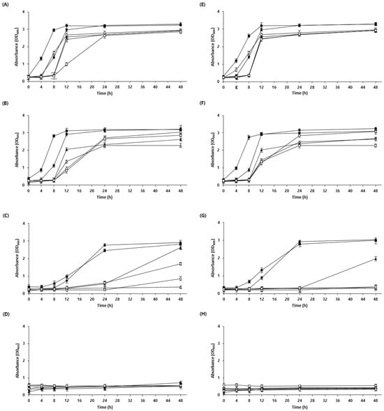 Growth curve of LAB cultivated at different pH values. (A–D) LAB were cultivated in an MRS medium using lactic acid to adjust the pH. (A) pH 6.5, (B) pH 5.5, (C) pH 4.5, and (D) pH 3.5. (E–H) LAB were cultivated in an MRS medium using acetic acid to adjust the pH. (E) pH 6.5, (F) pH 5.5, (G) pH 4.5, and (H) pH 3.5. Isolate Lactobacillus brevis AQ2 (●), isolate Leuconostoc citreum YC2 (▲), isolate Weissella confusa BAQ2 (■), KCTC3102 (○), KCTC3524 (△), and KCTC3499 (□) were grown for 48 h.