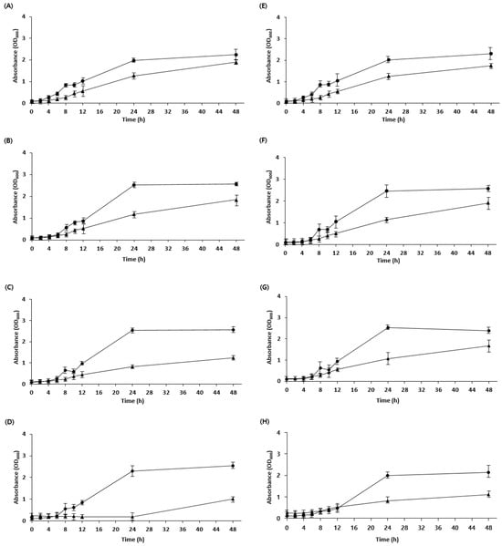 Growth curve of yeast strains cultivated at different pH values. (A–D) Yeast strains were cultivated in a PDB medium using lactic acid to adjust the pH. (A) pH 5.0, (B) pH 4.5, (C) pH 4.0, and (D) pH 3.5. (E–H) Yeast strains were cultivated in a PDB medium using acetic acid to adjust the pH. (E) pH 5.0, (F) pH 4.5, (G) pH 4.0, and (H) pH 3.5. Isolate Saccharomyces cerevisiae BW1 (●) and KCTC17612 (▲) were grown for 48 h.