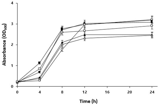 We evaluated the ability of the isolated LAB and yeast to grow in the presence of acetic acid or lactic acid and tolerate low pH conditions. Isolated (Lactobacillus brevis AQ2, Leuconostoc citreum YC2, Weissella confusa BAQ2, and Saccharomyces cerevisiae BW1) and commercial bacteria (KCTC3102 L. brevis, KCTC3524 L. citreum, KCTC3499 W. confusa, and KCTC17612 S. cerevisiae) that had been stored at −70 °C were inoculated at 1% in 5 mL of MRS broth or PDB broth and pre-cultured at 30 °C for 24 h. The pre-cultured strains were then inoculated at 1% into modified MRS broth (pH 6.5, 5.5, 4.5, and 3.5) and PDB broth (pH 5.0, 4.5, 4.0, and 3.5) containing lactic acid and acetic acid, respectively, and incubated at 30 °C for 48 h. To analyze cell growth, samples were collected periodically, and the optical density at 600 nm was measured using a spectrophotometer (Jasco V-650 spectrophotometer, Jasco Co., Tokyo, Japan).