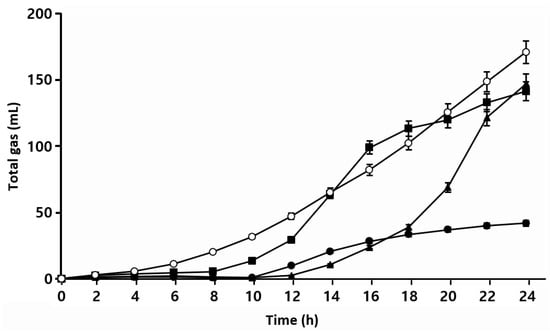 Total gas production of isolated strains was monitored using a Fermograph. Isolate Lactobacillus brevis AQ2 (●), isolate Leuconostoc citreum YC2 (▲), isolate Weissella confusa BAQ2 (■), and Saccharomyces cerevisiae BW1 (○) were grown at 30 °C for 24 h.