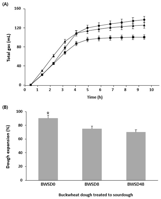 Comparison of GF bread dough containing GF sourdough prepared using different fermentation times. (A) Rheofermentographic profiles of the different doughs. Dough obtained by adding GF sourdough fermented 0 h (BWSD0) to the GF bread recipe (●); dough obtained by adding GF sourdough fermented 8 h (BWSD8) to the GF bread recipe (▲); dough obtained by adding GF sourdough fermented 48 h (BWSD48) to the GF bread recipe (■). (B) Degree of expansion of bread dough prepared with GF sourdough after 4 h fermentation. *: It showed the significant differences.