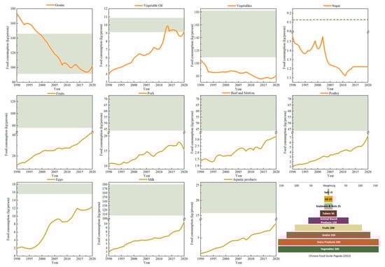 24]. Among animal foods, poultry consumption experienced the most substantial increase, marking a 5.85-fold increase with annual per capita consumption rising from 1.08 kg to 7.40 kg. Milk consumption also represents a high increase (5.42-fold), from 1.93 kg per capita to 12.36 kg per capita. However, it is important to note that the share of cereal consumption has been on a declining trend, with an annual per capita reduction of 70.93 kg. Notably, the structure of livestock and poultry meat consumption in China changed considerably between 1990 and 2020. Pork consumption decreased from 81.37% to 59.02% of the total livestock meat consumption, and poultry meat increased from 8.28% to 28.51%. But during the study period, only in 2020 did China’s per capita consumption of animal-based food reach the minimum of the Dietary Guidelines for Residents. This result was consistent with those in Xin’s study [