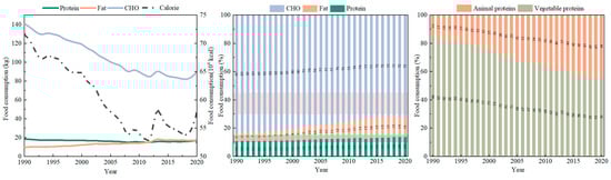 31]. In terms of nutrient energy ratios, the ratio of fat–energy increased from 5.68% to 13.95%; however, it is still 6.05% lower than the minimum recommended intake. On the other hand, the ratio of carbohydrate–energy decreased from 83.48% to 72.33%, but it remained 7.33% higher than the maximum recommended ratio. The ratio of protein–energy fell within the recommended range, and it increased to 13.71%. Moreover, the amino acid composition of the protein provided by animal foods is more suited to the needs of the human body, making it a better-quality protein for human needs than the protein provided by plant foods. The structure of protein intake was optimized from 1990 to 2020, with the proportion of animal protein intake increasing by 1.81 times from 15.67% to 43.95%. However, the proportion of vegetable protein in total protein consumption remained higher than that of animal protein consumption.