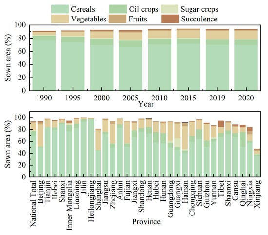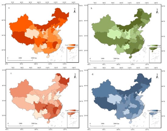 Figure 7). However, inconsistencies in the planting structures have led to reduced overall efficiency within the agricultural sector. Meanwhile, at the national level, distinct regional differences exist in agricultural systems, although grain production remains the dominant focus across all regions, followed by the cultivation of vegetables. Heilongjiang and Jilin had the highest proportions of grain cultivation areas, exceeding 90%. Conversely, regions such as Hainan, Beijing, Fujian, Shanghai, and Zhejiang had a significant share of vegetable cultivation, surpassing 30%. Green fodder represents a vital animal feed in China. However, its utilization remained notably low. Tibet, Ningxia, Qinghai, Inner Mongolia, and Gansu, concentrated in the northwestern livestock area of China, possessed a relatively rich resource in green fodder, whereas Hainan, Henan, and Shandong exhibited the lowest levels of green fodder cultivation areas. Additionally, the lowest 23 provinces reported less than 1% green fodder cultivation area. The exclusive emphasis on food production without due consideration of regional resource distribution differences has limited the exploitation of regional advantages, significantly impacting the diversification and comprehensive growth of the agricultural sector and constraining the depth and breadth of agricultural development.