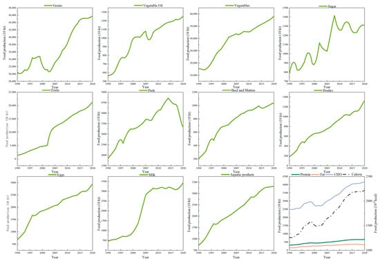46]. This growth resulted in an overall increase in food supply capacity. However, the growth rates varied among different food supplies. Fruit, milk, and poultry meat production experienced high growth rates, while pork, sugar, and grain production had relatively low growth rates. Among them, the growth rate of fruits was an impressive 14.31 times higher, while grain production only increased by a factor of 0.5. Notably, the pig industry has faced constraints imposed by local governments because of pollution, epidemics, and other risks since 2015, particularly after the outbreak of African swine fever. This led to a steep decline in pork supplies [