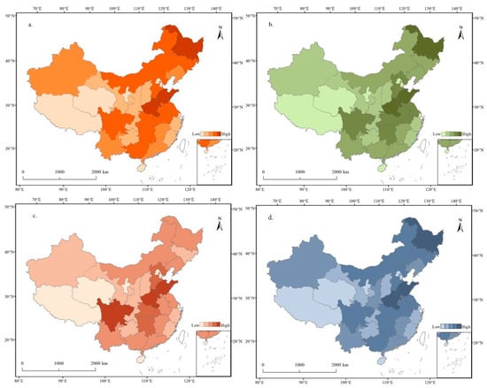 48]. The former encompasses elements of the natural environment that can be utilized, such as land, water resources, climate resources, etc.; the latter involves agricultural policies, agricultural labor, capital inputs, agricultural technology, etc. The Northeast Plain, Huanghuaihai Plain, Yangtze Plain, and Sichuan Plain have natural and economic resource advantages. However, China’s agricultural diversification is currently restricted by policies that make it difficult to capitalize on the agricultural advantages of the Loess Plateau and Qinghai–Tibet Plateau regions.