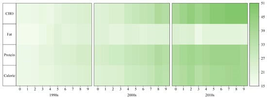 Figure 4). Provinces with high energy intake were distributed in bands. In particular, provinces with high energy intake in the northern region included Heilongjiang, Inner Mongolia, Jilin, Liaoning, Xinjiang, and Hebei. In contrast, high energy intake provinces in the southern region included Jiangxi, Hunan, Chongqing, Sichuan, and Tibet. Areas with high protein consumption showed a dispersed multipoint distribution. The top three provinces with high protein intake were Guangdong, Inner Mongolia, and Chongqing, which were the centers, with annual per capita consumptions ranging from 19.02 kg to 20.67 kg. High-fat consumption areas were primarily located in the regions south of the Yangtze River. Carbohydrate consumption patterns tended to align with energy consumption, with Tibet, Inner Mongolia, Heilongjiang, and Hebei exhibiting the highest carbohydrate intake. Provinces such as Zhejiang, Shanghai, Guangdong, and Jiangsu were notable for their high nutritional levels, characterized by a diverse and balanced diet. These regions are considered representative of a healthy Chinese dietary pattern, marked by a variety of foods, mild flavors, lower salt content, and a high intake of vegetables, fruits, fish, prawns, dairy products, and legumes. Such dietary patterns contribute to avoiding nutritional deficiencies and diet-related chronic diseases, resulting in relatively high life expectancies [