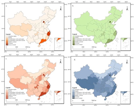 Figure 10). Conversely, regions with low LCCI values were predominantly situated in the Huanghuaihai Plain and Northeast Plain, encompassing provinces like Henan, Shandong, and Jilin. This signified that these regions presented an excess supply over demand and played a significant role in agricultural production. Specifically, the energy LCCI showed an abundant surplus state in 21 provinces. Notably, Guangdong experienced slight overload, while Zhejiang was in overload; moreover, Beijing and Shanghai were in severe overload. The spatial structures of the protein, carbohydrate, and energy LCCIs were quite similar, while the fat LCCI exhibited substantial disparities. The fat LCCI demonstrated an abundant surplus state in only six provinces of Inner Mongolia, Henan, Jilin, Qinghai, Shandong, and Ningxia, slight overload in Chongqing, and severe overload in the five provinces Beijing, Shanghai, Zhejiang, Tianjin, and Guangdong. This revealed significant disparities in fat supply demand matching across most provinces, pinpointing regions with a pronounced shortfall in regional LCC.