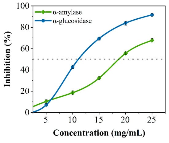 The significant increase in postprandial blood glucose is unfavorable for patients with diabetes. Research has shown that reducing the intake of rapidly digested starch and delaying the digestion time of carbohydrates is effective in alleviating the phenomenon of elevated blood sugar in the body [4]. α-Amylase and α-glucosidase are key enzymes in the digestion of dietary starch in the human body, and they can ultimately convert starch into glucose in the digestive tract [5]. α-Amylase hydrolyzes starch into dextrin, oligosaccharides, and glucose. α-glucosidase is one of the key enzymes that decompose disaccharides into glucose [6]. Inhibition of these enzymes can delay the hydrolysis of dietary starch in the digestive system, lower blood glucose levels, slow down glucose metabolism, and delay glucose absorption [7]. At present, acarbose is used as a glucosidase inhibitor, but long-term use of this drug can cause gastrointestinal side effects. Therefore, the development of natural sources of hypoglycemic enzyme inhibitors with fewer side effects is important.