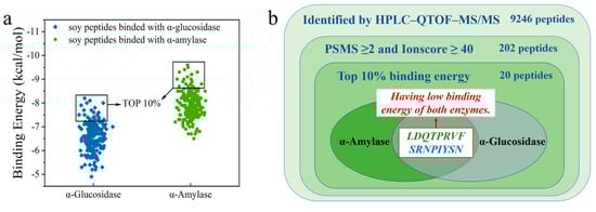 (a) Binding energy of peptide with α-amylase and α-glucosidase; (b) Venn diagram for peptide screening.